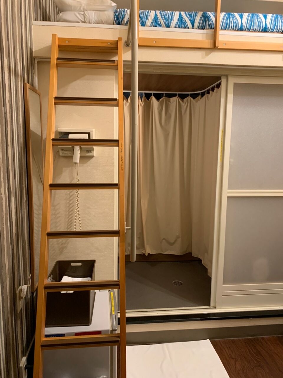 省スペースのために部屋がロフトタイプになっており、ロフト下の部分にトイレとシャワーがあるという不思議な作りとなっている。