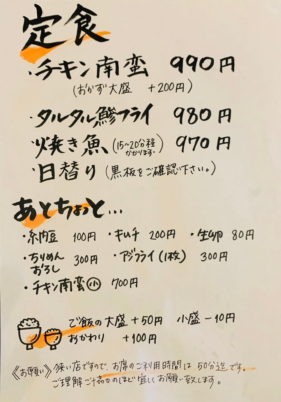 ランチメニューは名物の「チキン南蛮」をはじめ「タルタルアジフライ」、「焼き魚」などの和定食がメイン。