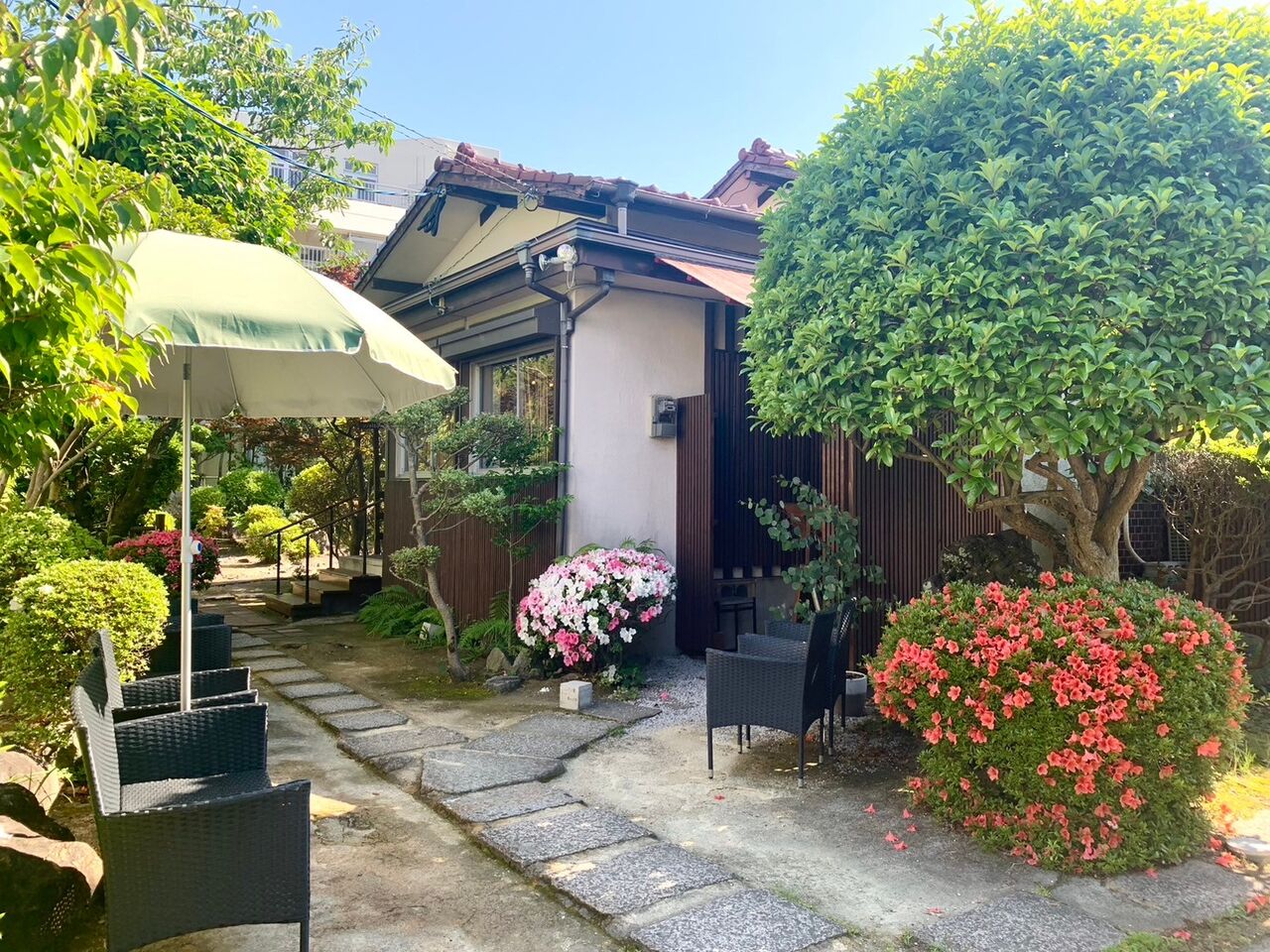 古民家をリノベーションしており、白とベージュを基調とした柔らかな雰囲気が魅力。