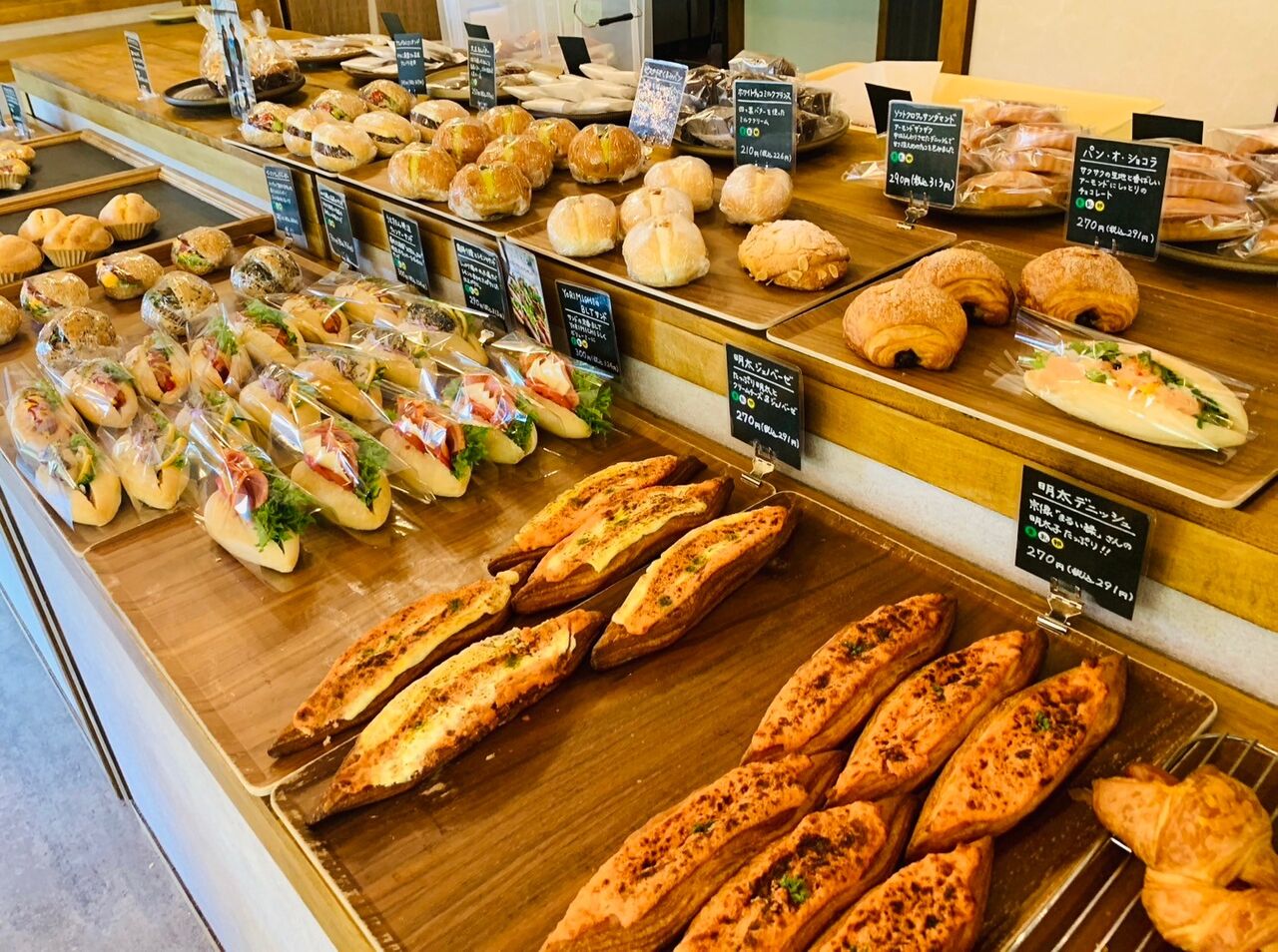 サンドイッチや惣菜パンなどの食事系から、クリームパンや焼き菓子などの甘味系まで幅広く並んでいた。