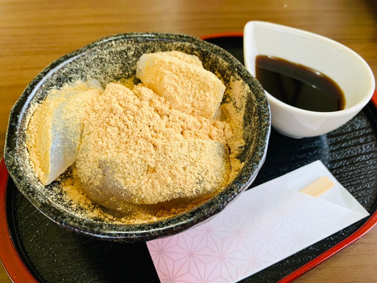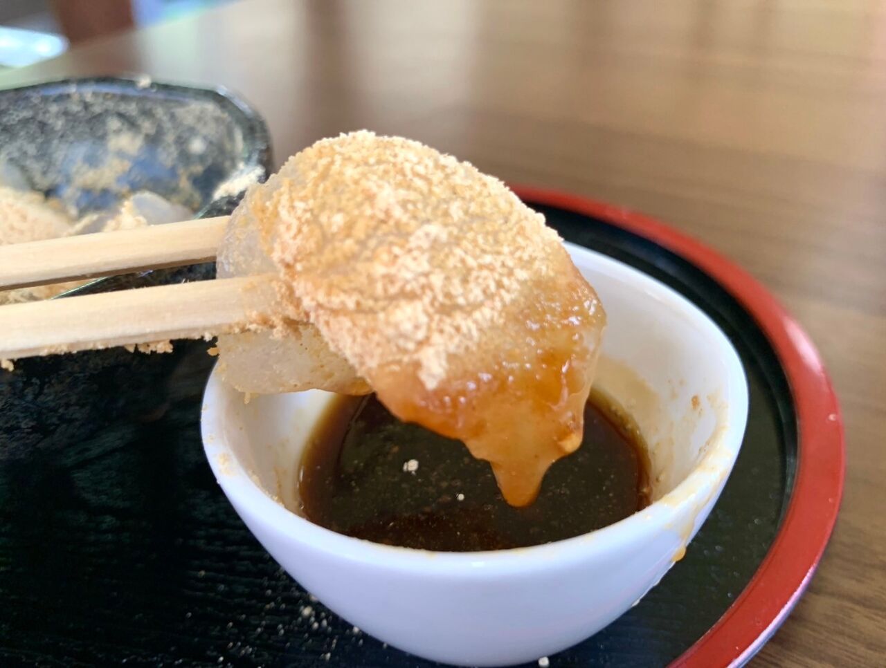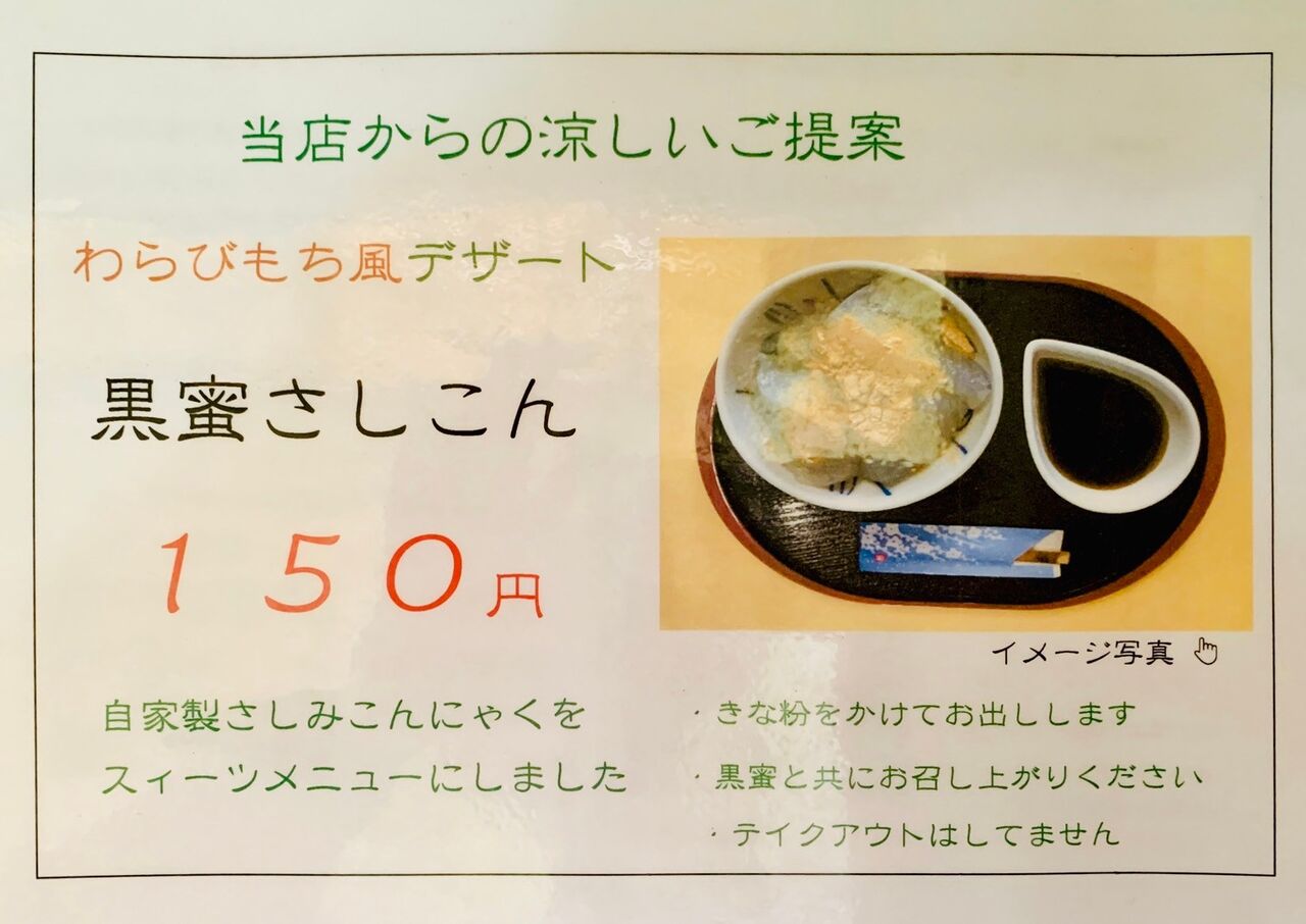 フワッと柔らかな食感の刺身こんにゃくに、ねっとりと濃厚な黒蜜が良く絡む。