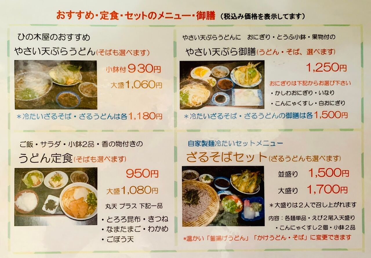 メニューには自家製うどんや蕎麦をメインに、天ぷら付きのボリュームセットなどニーズに合わせて選ぶことができる。