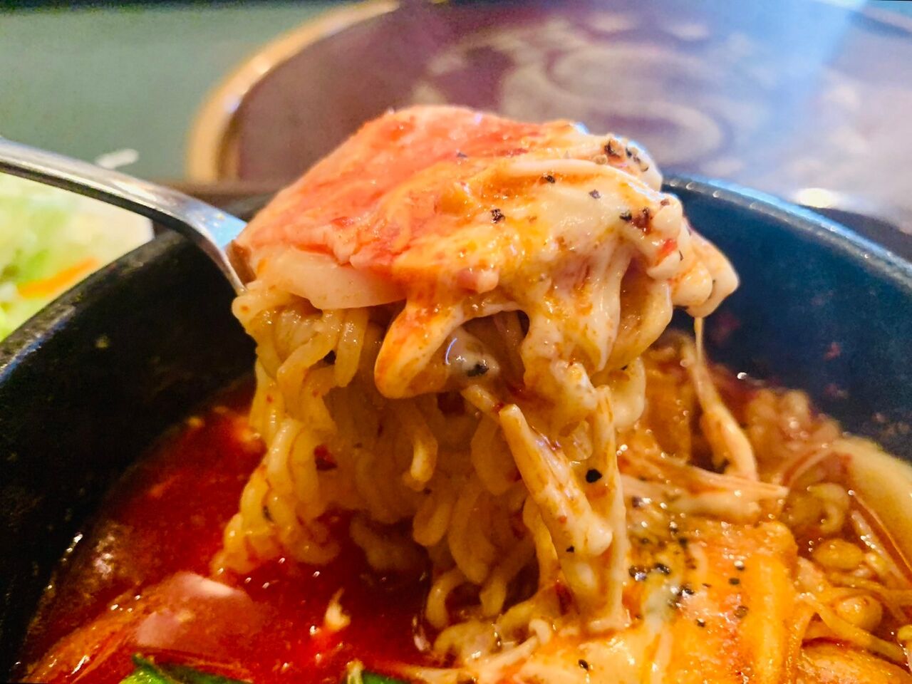 ハムやウィンナー、ベーコン、韓国おでん、トック(餅)、インスタント麺、チーズ、野菜と具沢山。
