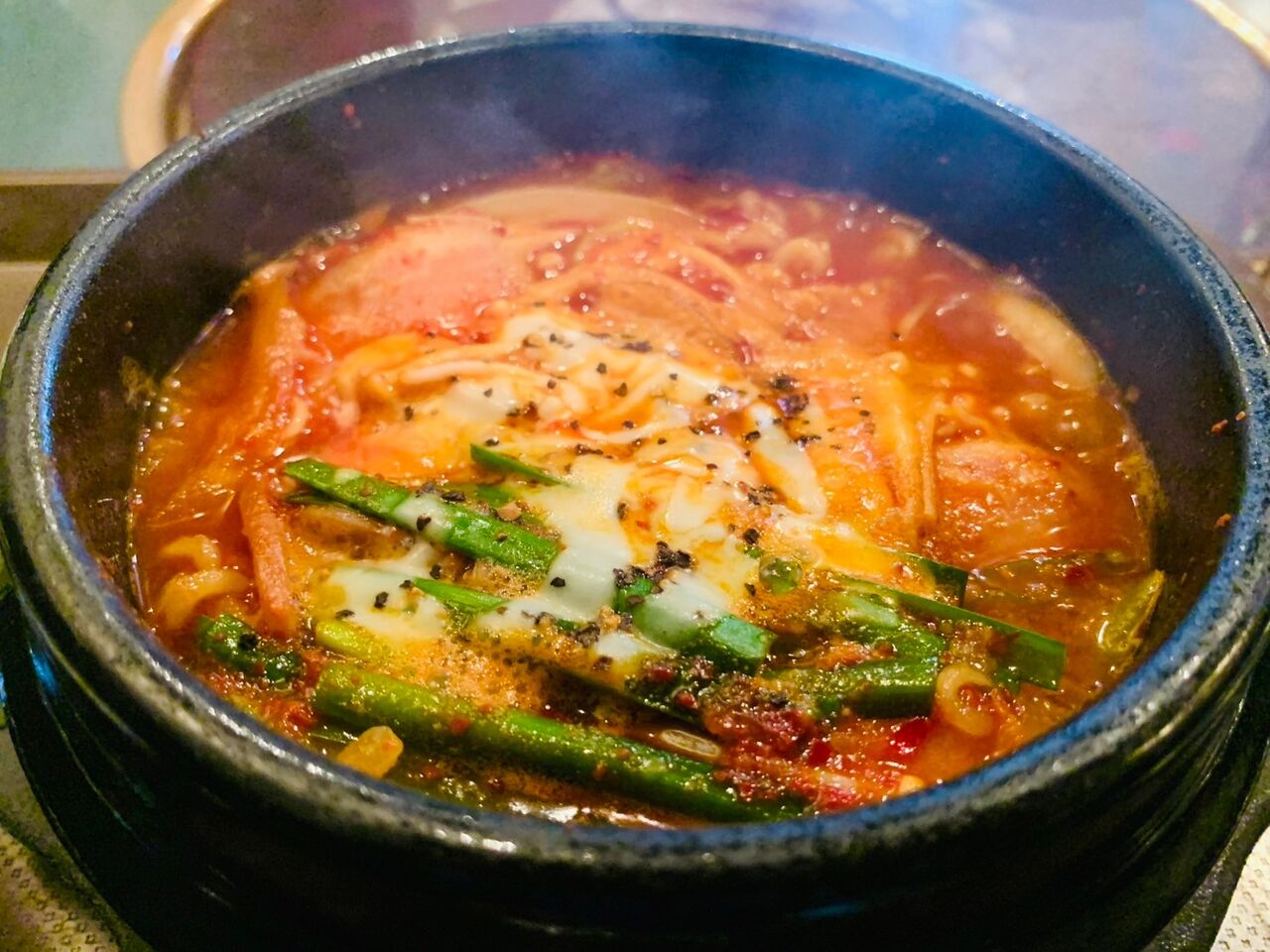 3日間煮込んだこだわりの牛骨スープから作るプデチゲは絶品。
