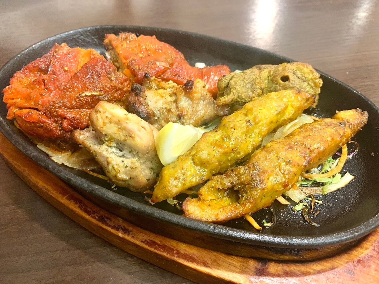 チキンシークカバブ(つくね)、チキンティッカ、マライティッカ、タンドリーチキンのセット。